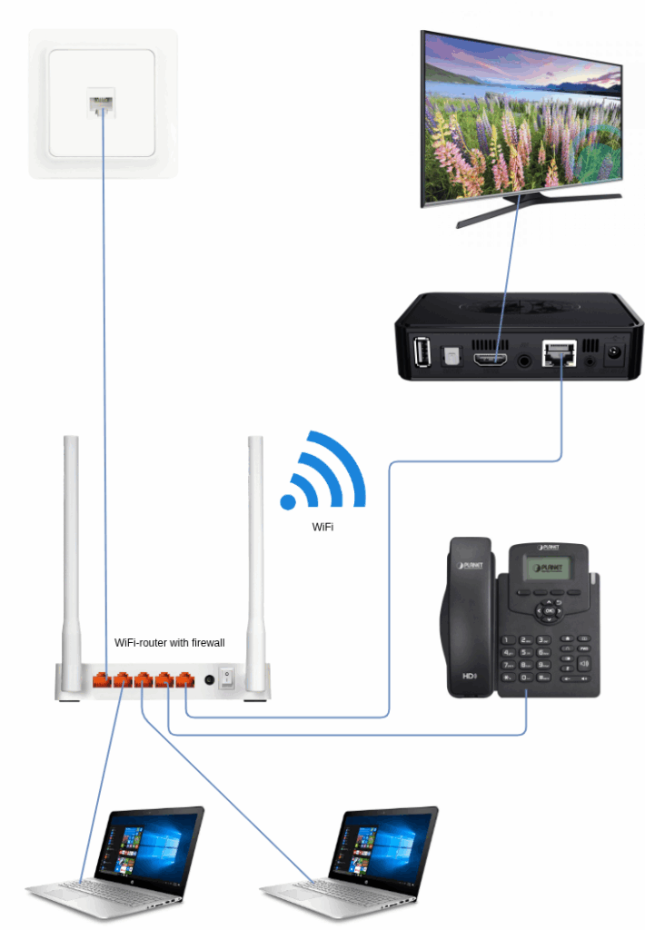 If you have equipment that needs to be connected with a cable instead of WiFi, connect them to a LAN-port on the WiFi-router.
