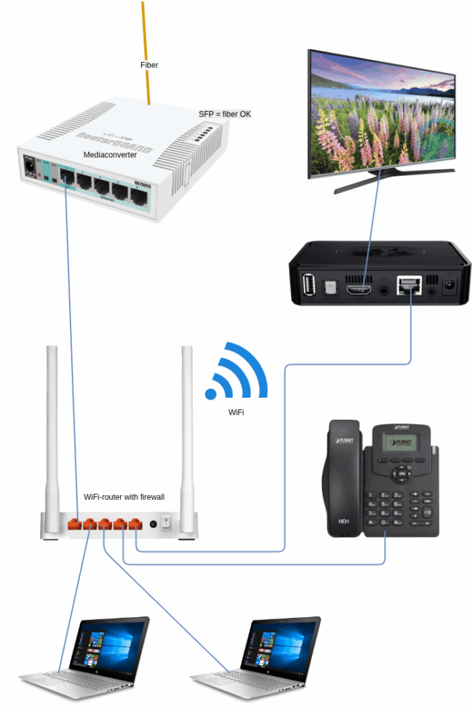Your WiFi-router should be connected with an ethernet-cable from its WAN/internet-port to the first port on the mediaconverter. Do not connect a LAN-port on the WiFi-router to the mediaconverter.